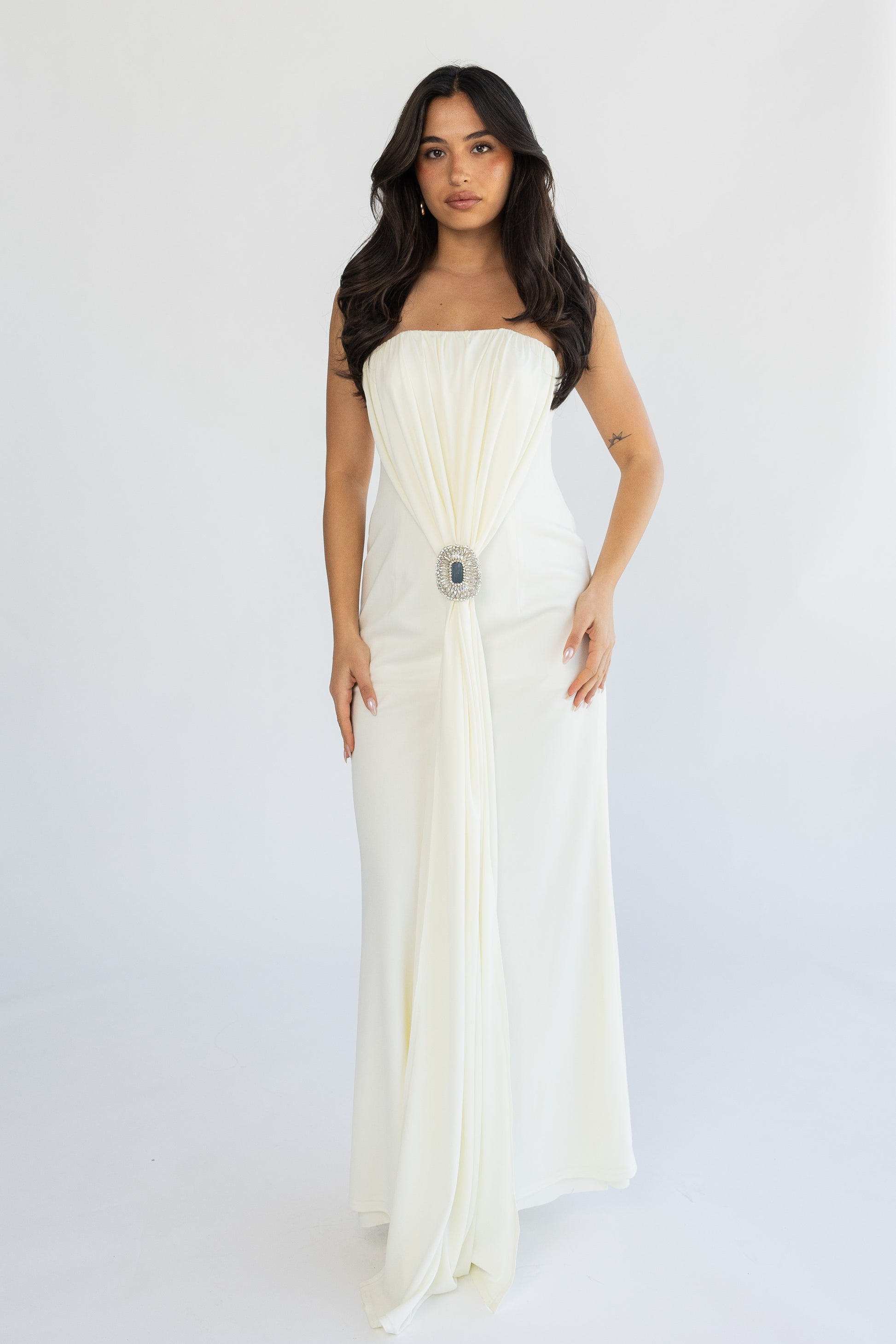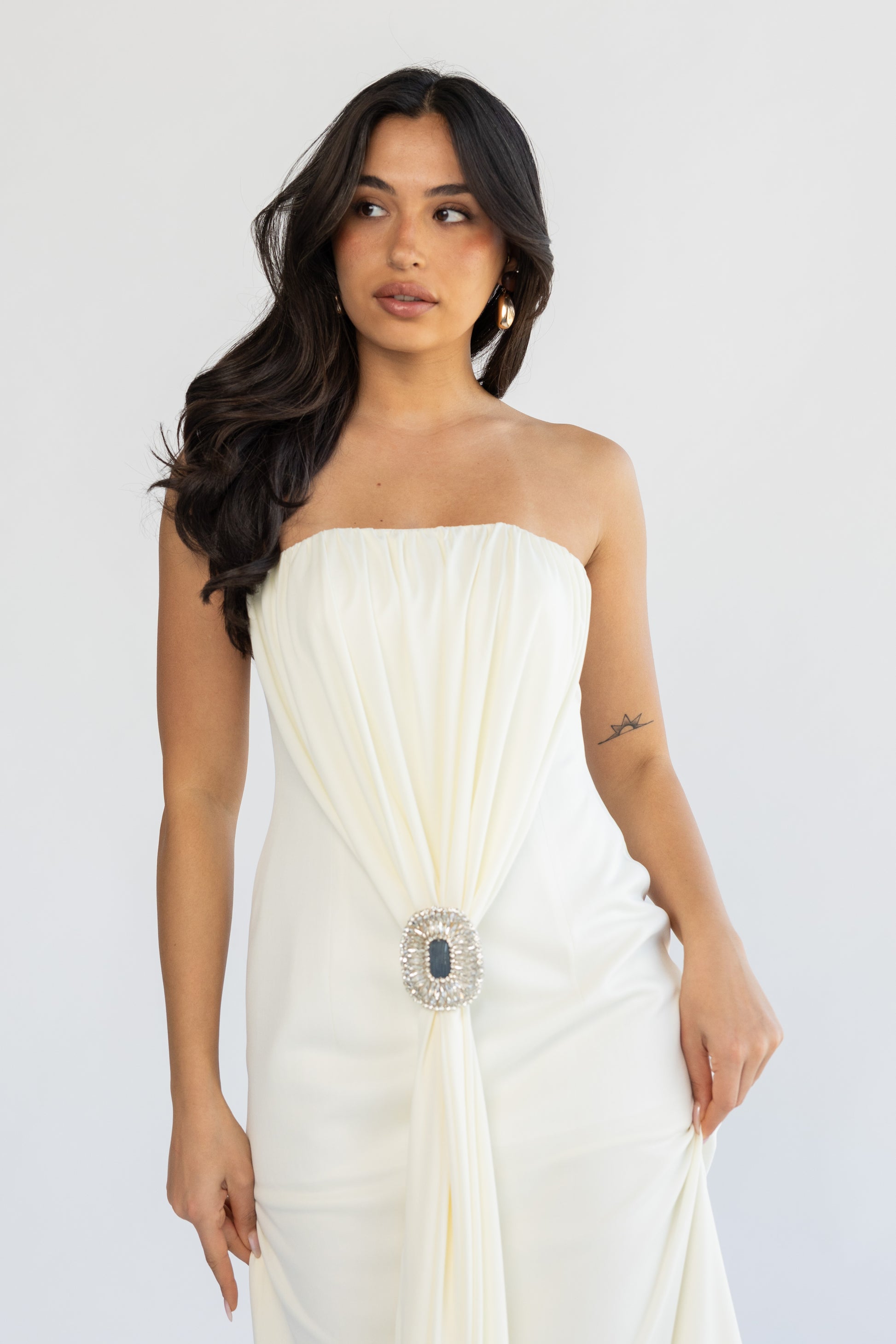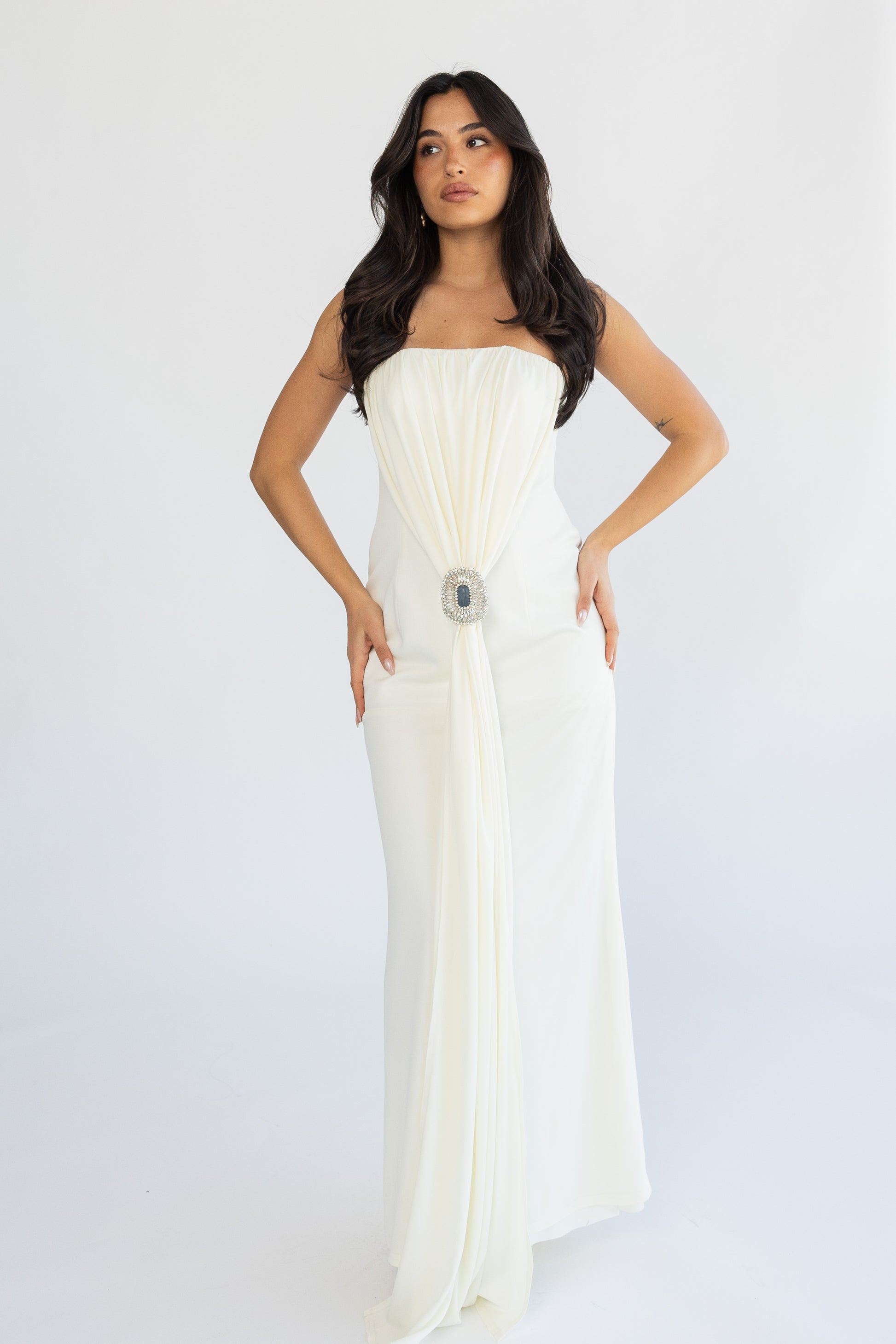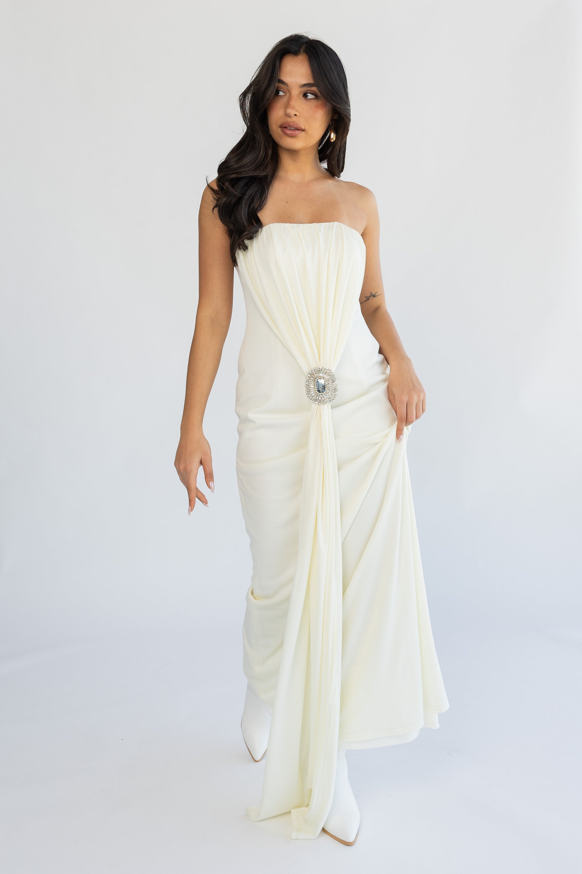 inner dress with handmade brooch.